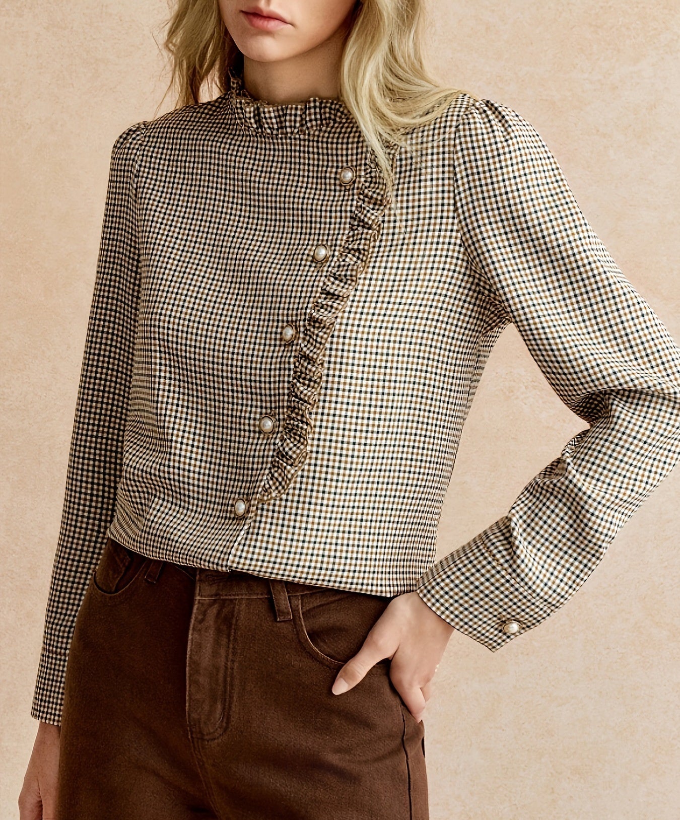 Houndstooth Ruffled Small Stand-up Collar Side-button-front Shirt